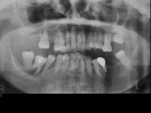 横から見るとわかるのですが前歯がうまく噛み合っていない歯が多いため奥歯に噛む力が集中して歯周病が一気に進行した可能性が高いと思われます なので奥歯だけをインプラントなどで治療しても、またそのインプラントがダメになってしまいます。また奥歯が崩壊することによって噛み合わせが深くなっておりこのままでは歯を入れることもできません