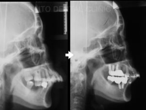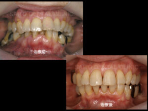 また噛み合わせだけでなく上顎前突(出っ歯)だった状態も改善され見かけもかなりよくなりました 術前と比較して噛み合わせる歯が増えたためそれぞれの負担が小さくなり、インプラントも含め長期的に 長持ちする状態となり15年トラブルなく過ごされています