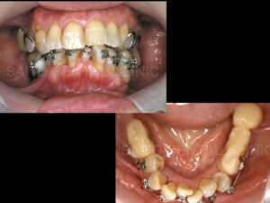 そこでまずは仮の部分義歯によって本来の噛み合わせの高さまで回復させていただきます すると前歯が全く噛み合わないので前歯を噛み合わせるためには歯列矯正治療が必要なのですが歯が少ないため歯列矯正のためにも奥歯にインプラント治療を施し、そのインプラントを利用して歯列矯正治療を行う計画を立てていきます