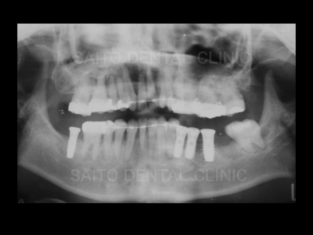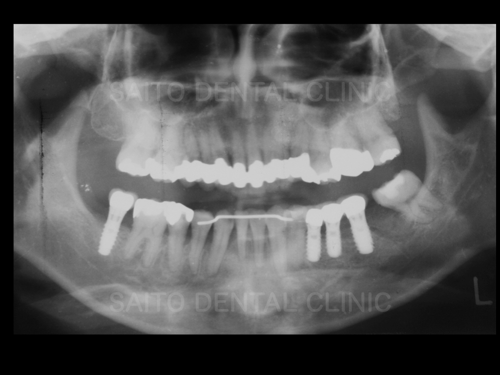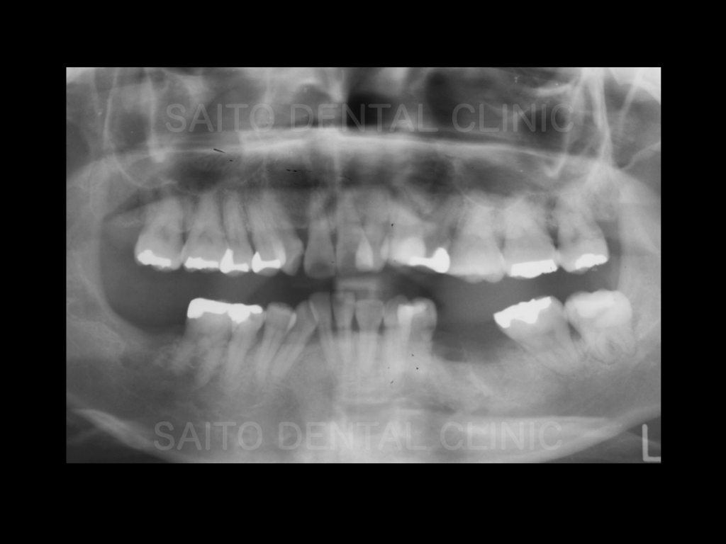 レントゲンを見ても歯並びが悪いことがよくわかります。治療計画を立案するにあたって患者さんは入れ歯を避け、歯が長持ちすることを希望されたため、歯の欠損部にはインプラント治療を、