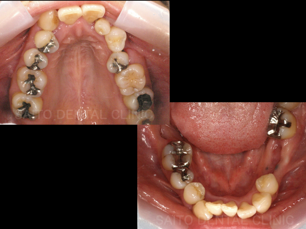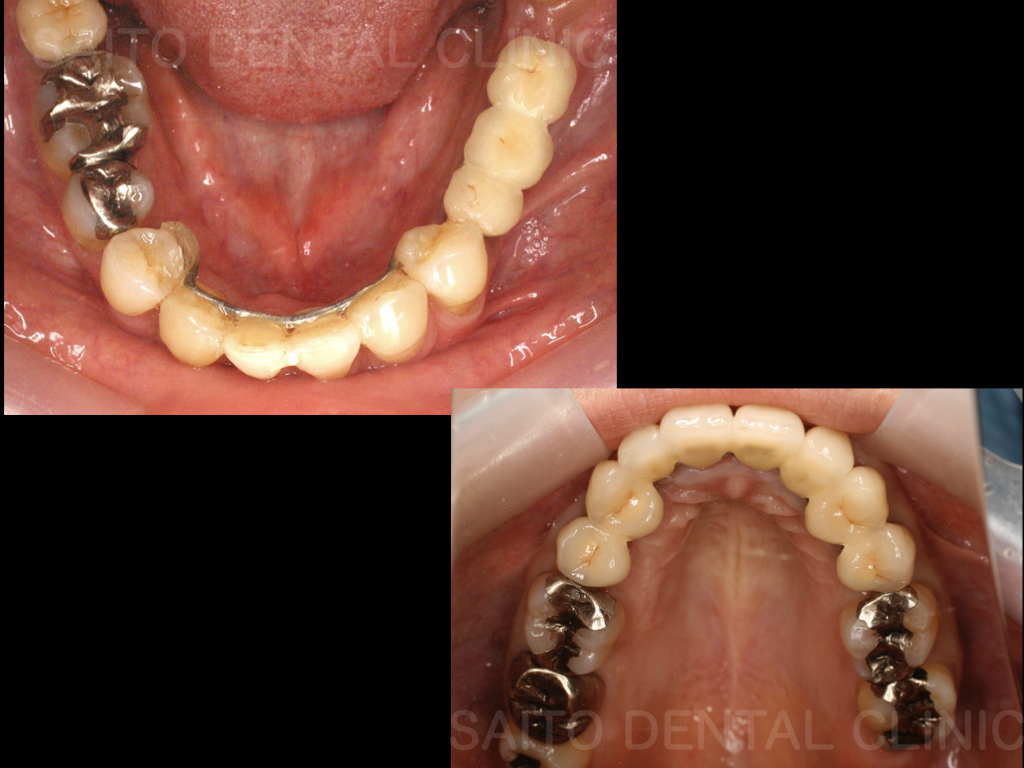 不正咬合には歯列矯正による治療を、歯周病の治療と重症な部分については被せ物による連結固定による補強をおすすめしました